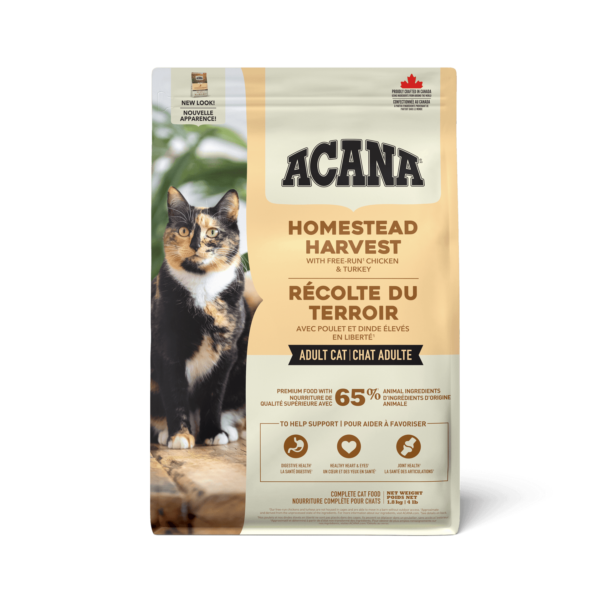 ACANA Premium Cat Homestead Harvest is a nutrient-dense recipe that is crafted with 65% quality animal ingredients, including free-run chicken and turkey. Its high protein content helps promote strong muscles and bones, a shiny coat and healthy skin, as well as a healthy digestive and immune system. Nourish your cat with the best quality poultry you can find.