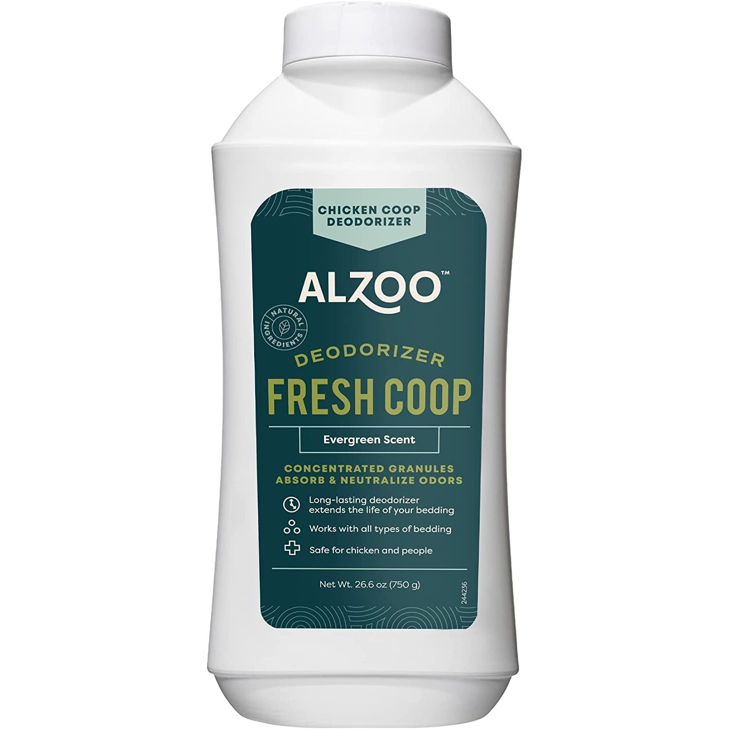 Alzoo My Fresh Coop is a totally new concept in caring for backyard chickens. Embarrassed about foul odor from your backyard fowl’s coop? Sprinkle Evergreen-scented My Fresh Coop across coop shavings or bedding between cleanings to keep coops smelling clean and fresh. Alzoo Chicken Coop Deodorizer removes odor and extends the life of your coop bedding by trapping and neutralizing unpleasant odors. It prevents odor formation and helps keep your chicken coop smelling fresh and clean.