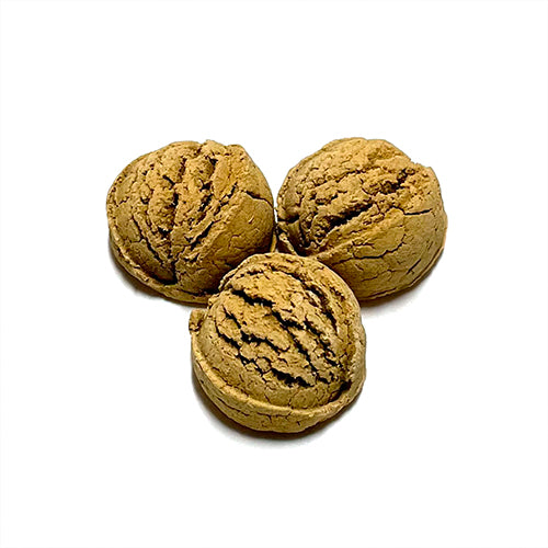 These pumpkin & ginger cookies are a tasty low-fat and low-protein option (great for dogs with liver and kidney issues). Pumpkin is great for sensitive stomachs, so these should be an on hand staple in any cookie jar. These are a smaller treat, but please note, they are thicker than our other treats, therefore not as easy to break in half.