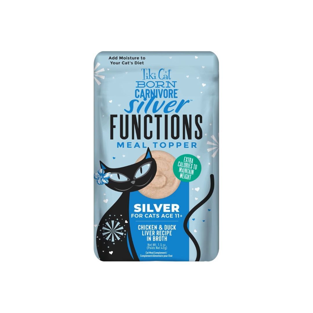 The Tiki Cat Born Carnivore Silver Functional Cat Food Topper is a su-purr tasty way to give your senior cat nutrition customized just for his life stage. Just squeeze this silky smooth topper on Tiki Cat Born Carnivore dry food (sold separately) for an extra boost of protein, moisture and support for healthy joints and a strong immune system. It’s a paw-some way to give your furbaby the nutrition he needs in his silver years.